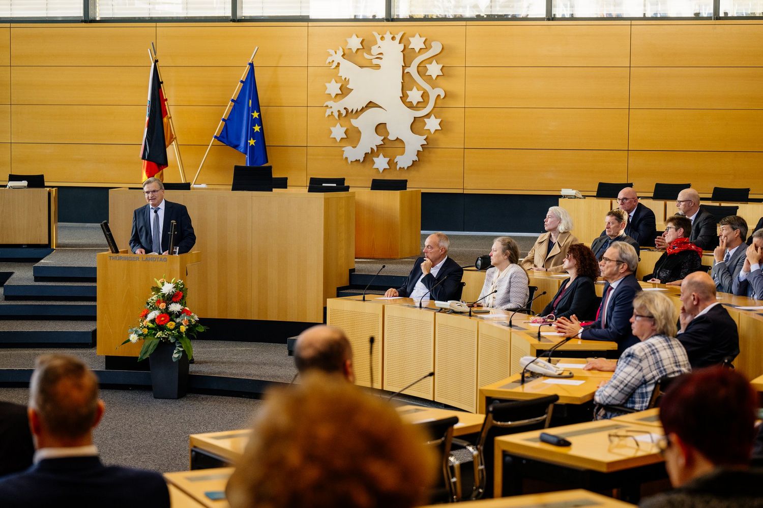 Mit einem Festakt feierte der Thüringer Landtag am Freitag (25. Oktober) den Tag der Verfassung. Zu den Feierlichkeiten kamen unter anderem Gäste aus Politik, Religion und Gesellschaft sowie der Britische Botschafter, Andrew Jonathan Mitchell. Schülerinnen und Schüler der Landesschülertage nahmen ebenso teil. Die Festrede hielt der ehemalige Rektor der Friedrich-Schiller-Universität Jena, Prof. Dr. Klaus Dicke, zur politischen Freiheit in der Bewährung. Landtagspräsident Dr. Thadäus König, der geschäftsführende Ministerpräsident Bodo Ramelow sowie der Präsident des Thüringer Verfassungsgerichtshofs sprachen Grußworte.